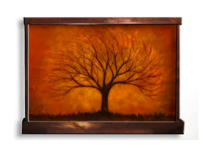 This wall fountain captures the rich, vibrant colors of October. 48" wide, 32" tall and 5" deep, it is made of copper, bronze, lexan, pigments, paints and chemicals. This can be made in any size, shape, or color palette. LED backlights and/or an LED light hood are available options. Comes with a pump, and all hardware to hang it.