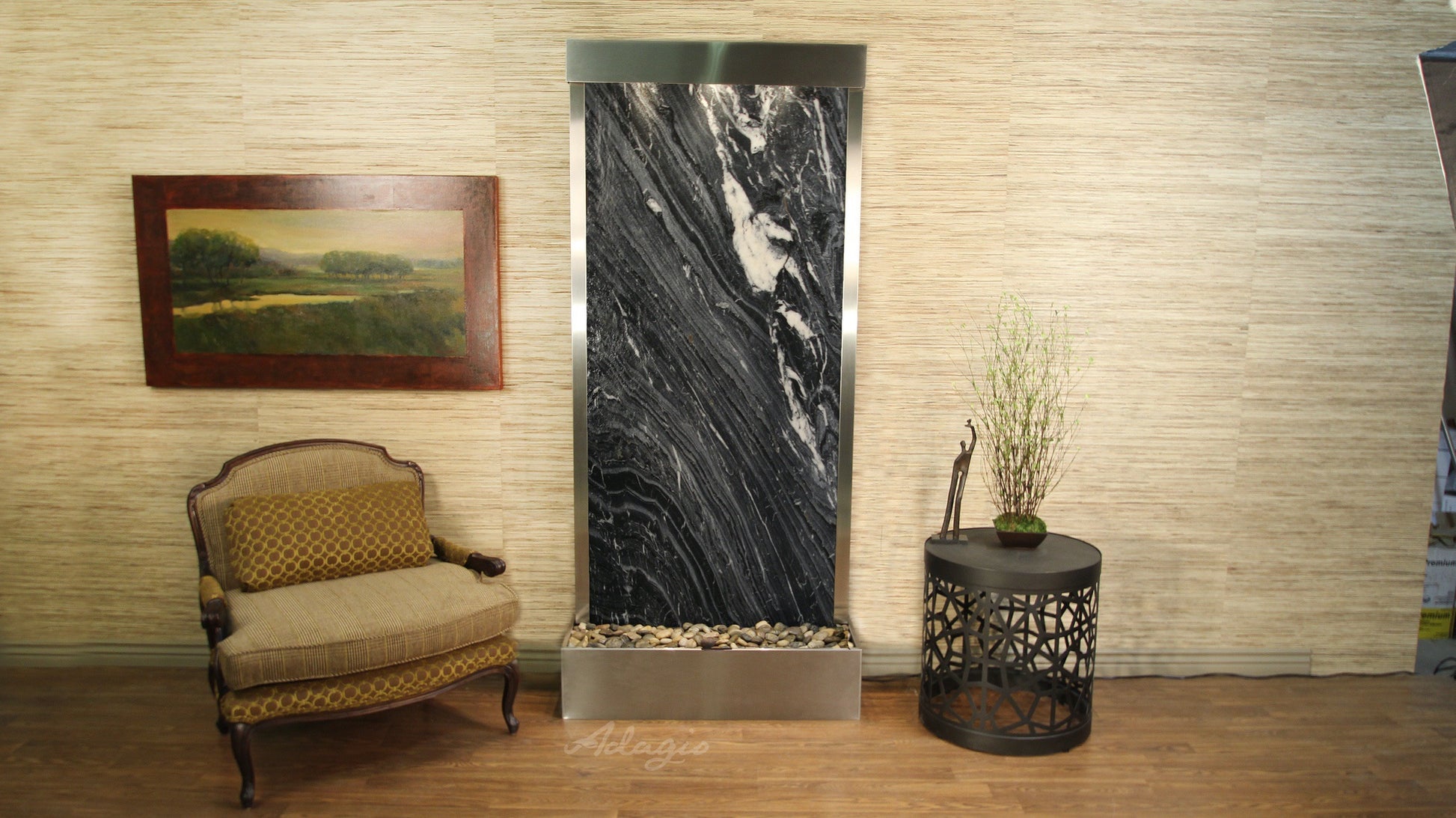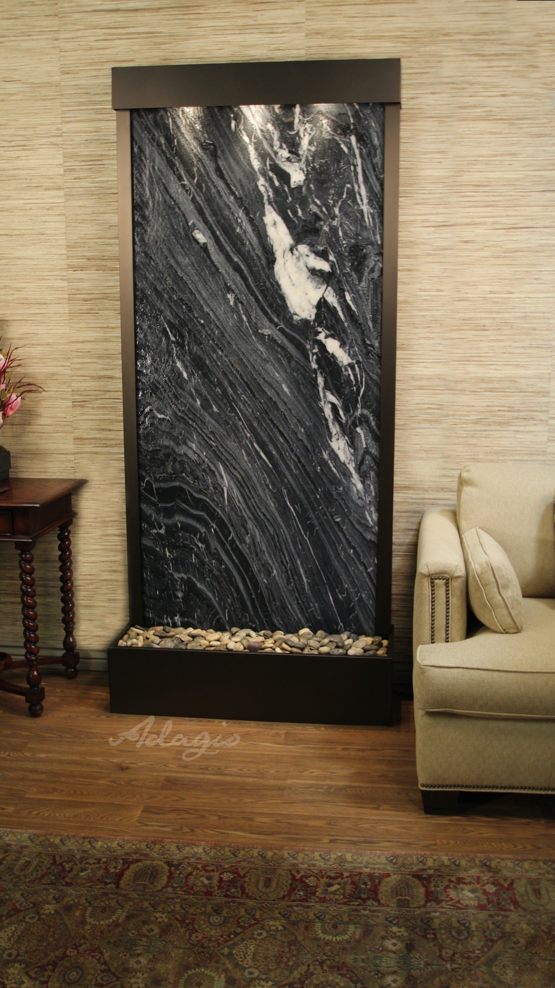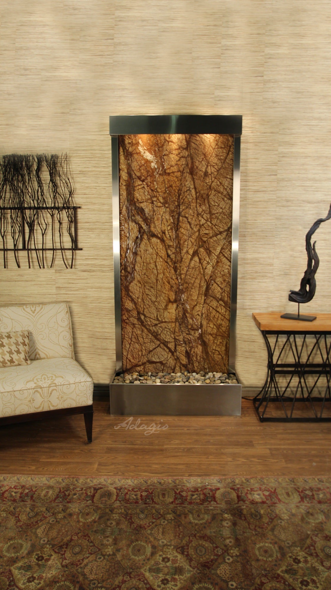 Tranquil River Water Fountain Floor Water Feature, Flush Mounted In The Rear Of The Base