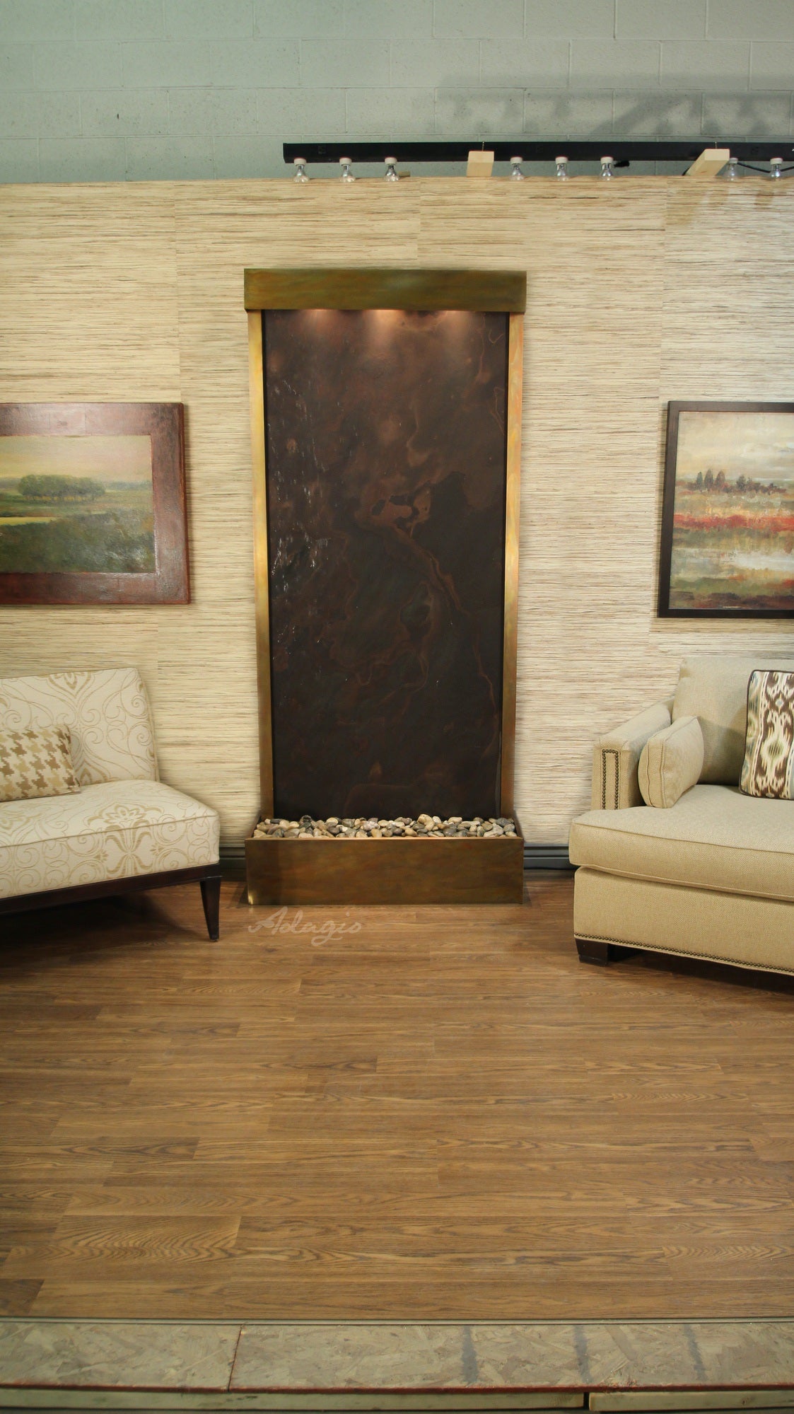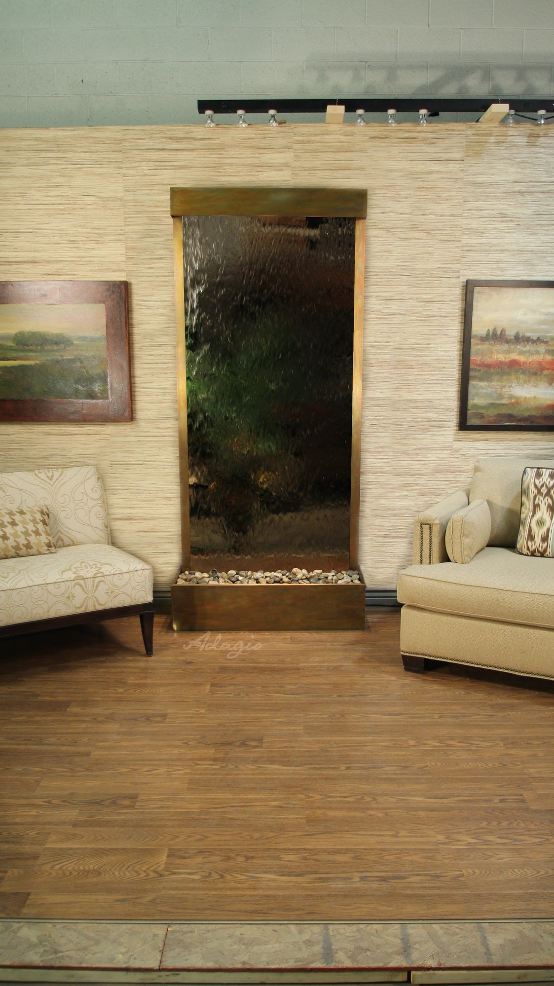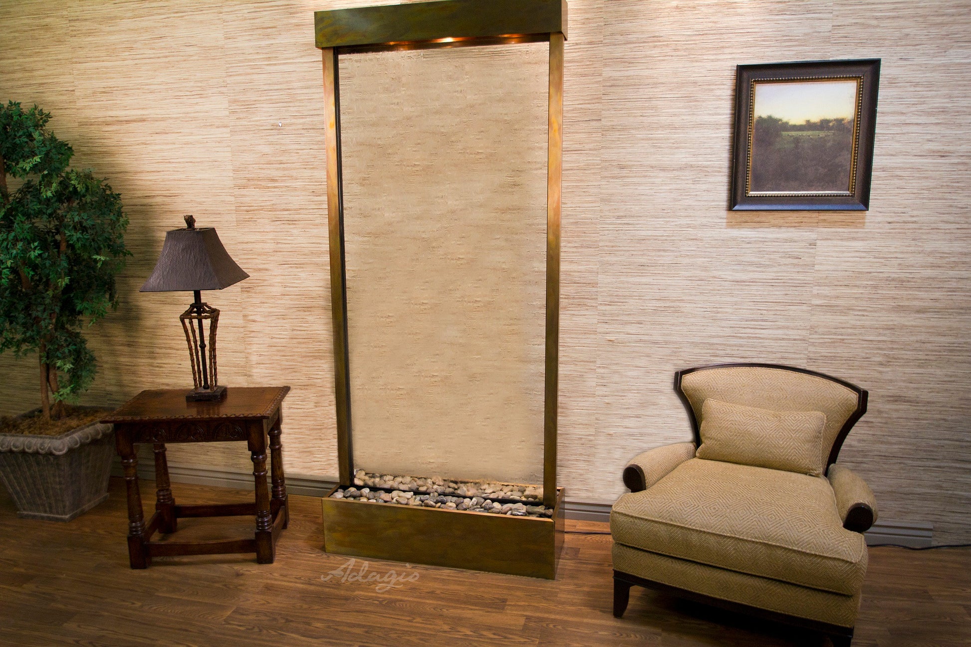 Tranquil River Water Fountain Floor Water Feature, Flush Mounted In The Rear Of The Base